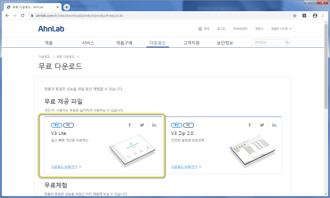 다운로드 탭에서는 무료다운로드라는 항목을 따로 분류해두고 있는데요. 거기에 제공파일을 보시면 개인 pc사용자가 무료로 설치해서 사용할수 있는 v3lite 라는 것이 보이실 꺼에요. 그곳에서 다운로드 바로가기메뉴를 이용하시면 우리가 원하는 v3무료백신을 찾을수 있습니다.