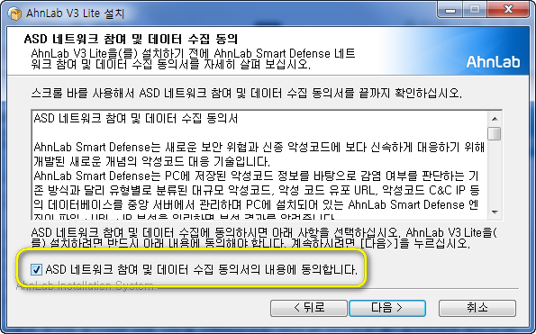 보통 요즘에 사용되는 백신들은 네트워크를 통한 바이러스 정보를 공유하더군요. 안랩에서도 ASD 네트워크 참여 및 데이터 수집 동의 항목이 있는데요. 이를 통해서 신규로 등장하는 바이러스를 퇴치할수 있는 기반이 생기는것 같더군요,상세한 내용은 읽어보시고 동의해야 설치가 가능합니다.