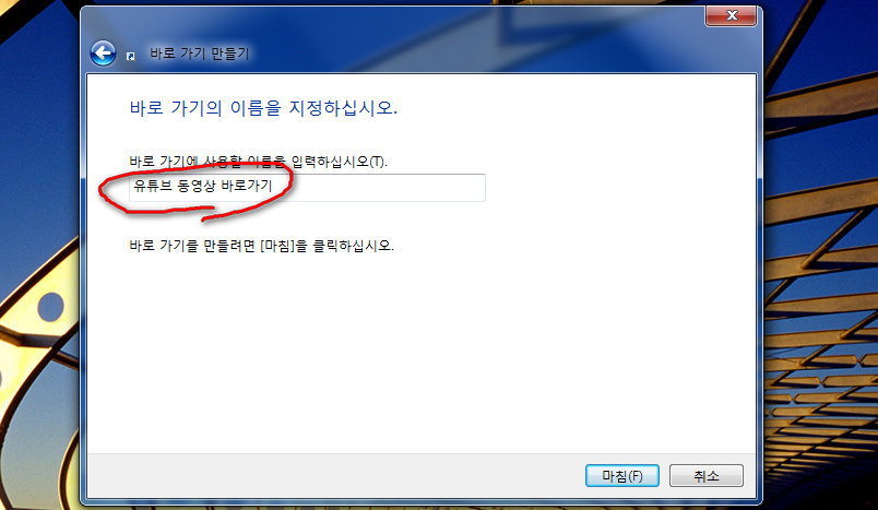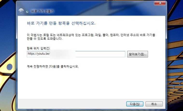 윈도우 바탕화면에서 사용할 유튜브 바로가기를 만들면 이해가 되실건데요. 준비해야하는것은 단지 동영상 URL뿐입니다. 나머지는 OS에서 제공하고 있는 기능이 있으니 말입니다. 새로만들기에서 찾을수 있는 해당 옵션으로 주소를 입력합니다.