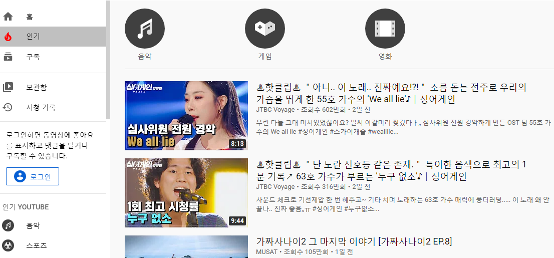 검색을 통해서 유튜브 동영상 바로가기를 찾는것은 일도 아니에요. 처음 사이트에 접속해보시면 인기있는 혹은 본인이 관심있어하는 영상을 추천해주는 페이지가 등장하게되는데요. 이게 좋다면 좋고 나쁘다면 나쁜기능이죠. 내가 뭘보는지 대충 감이 오거든요.