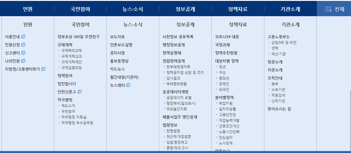 다시 고용노동부 사이트를 살펴보시면 오른쪽 상단부분에서 전체 메뉴를 알아보실수 있어요. 민원 / 국민참여 / 뉴스/ 정보공개/ 정책 등등이 주된 메뉴인데요. 이곳을 통해서 필요한 민원신청도 진행할수 있습니다.