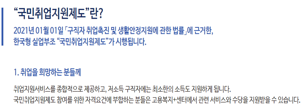 처음 접속된 홈페이지에서는 다양한 정책에 대한 내용이 보입니다. 메인에서는 1월1일을 기준으로 한국형 실업부조라고해서 국민취업지원제도를 시행한다고 되어있는데요. 취업을 하고 싶은데 못하는 분들을 돕기위한 것이라고 합니다.