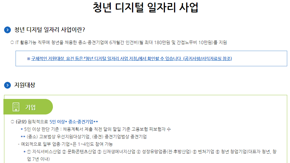이것이 다는 아닙니다. 회사를 운영하시는 분들이 인력을 채용할때 지원받을수 있는 사업들이 많은데요. 그중 한가지를 보면 청년 디지털 일자리 사업이라는 것도 있는데 생각보다 금액적으로 많이 도움을 주기때문에 채용하시기에는 좋을것 같습니다.