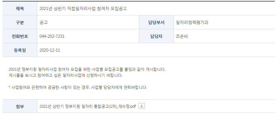 정부에서 하는 일자리사업 참여자를 모집한다는 공고도 2020년 12월 11일에 등록되어 있는데요. 이건 뭐냐면 국가기관에서 필요한 인력을 일시적으로 고용해서 하는것이라고 합니다. 고용노동부 홈페이지에서는 기관 통합 공고를 공유중인데요.