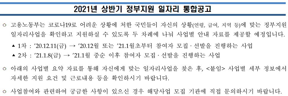 1차는 이미 기간이 지난것 같은데 2차 상반기 정부지원 일자리 공고는 21년 1월 8일 금요일부터 시작되어지게 됩니다. 한두개가 있는것이 아니라서 다 알려드리기는 그렇지만 직접 홈페이지에서 확인해보시기 바랍니다.