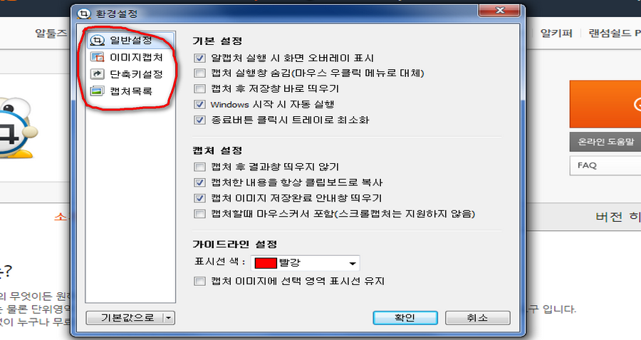 그곳에서 화면을 저장할때 가이드 라인 색상을 무엇을로 할지 바꿀수도 있도 윈도우 실행시 자동 실행하게하는 옵션도 있어요. 단측키설정에서 원하는 키보드 키를 지정하실수 있으니 편한걸로 바꾸어서 써도 됩니다.