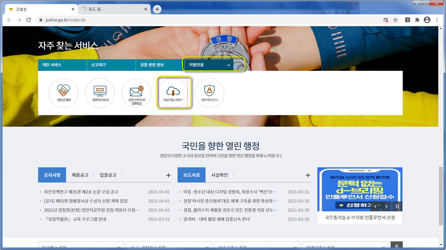 사이버경찰청은 국민이 안전하고 행복한 세상을 만들기위해서 웹에서도 운영되고 있는데요. 이를 통해서 많은 서비스를 이용해보실수 있습니다. 그중에 하나가 직원분들이 쓰는 자료이동서비스 이구요.