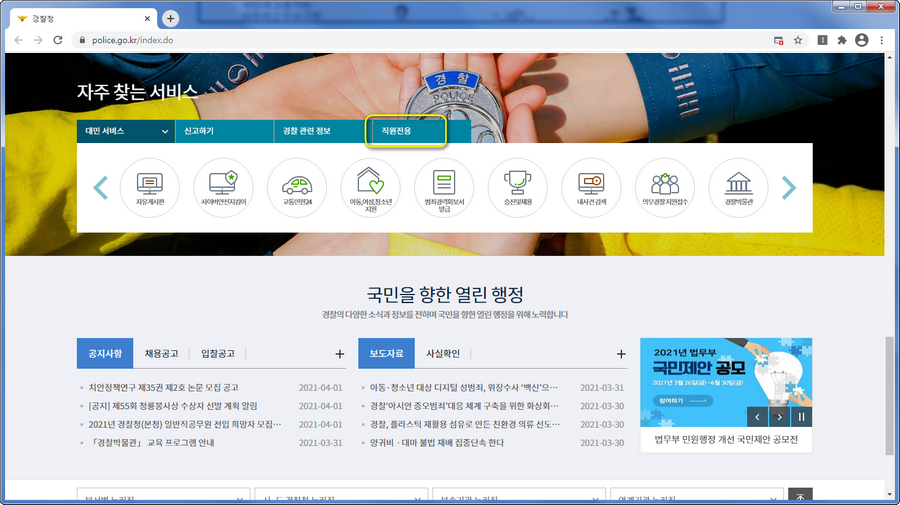 따뜻한 느낌의 사진이 우리를 맞이합니다. 경찰청이라고 해서 사이트도 뭔가 권위적이거나 딱딱한 느낌이지 않을까 생각했는데 이런게 편견이라고 하는것 같군요. 대략적으로 여기가 뭐하는곳인지 보실수 있는데요.