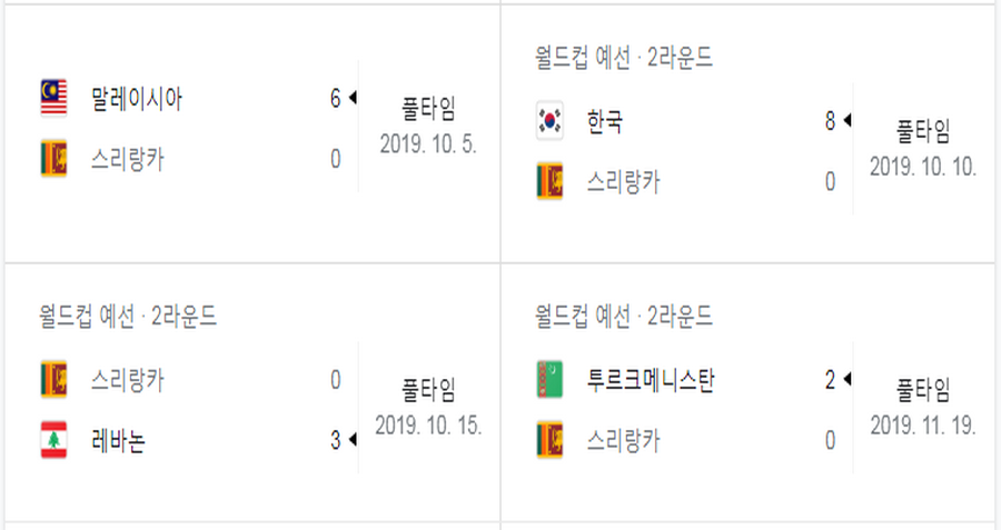 사실 다가오는 스리랑카의 전력은 그보다 더 낮다는 평가를 받고 있습니다. 우리나라는 월드컵 예선 2라운드에서 H조에 속해있는데요. 현재 우리는 4번의 경기에서 3승 1무를 기록중입니다. 스리랑카는 5전 5패를 기록하고 있구요.